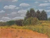 "Wattle Trees at Horseshoe Bend Farm, Keilor" (Oil on board, 35cm x 45cm, 2021)